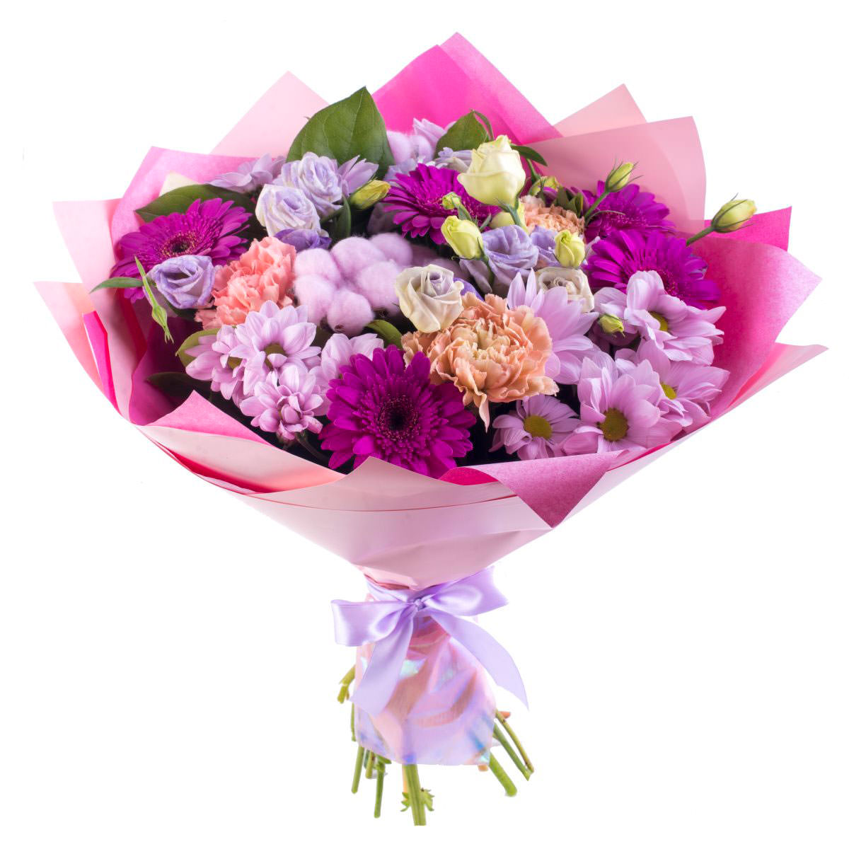 Хризантема кустовая, гербера, эустома, гвоздика, хлопок.