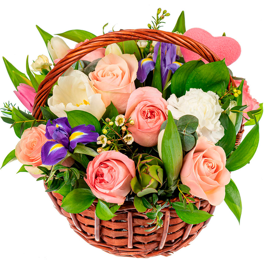 Роза, ирис, тюльпан, гвоздика, хамелациум, фисташка, зелень.